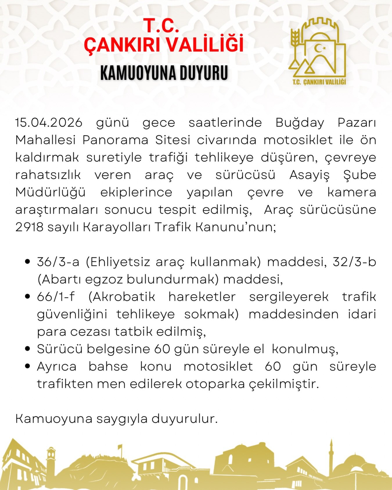 Çankırı Valiliği tarafından yapılan açıklamaya göre, 15 Nisan 2026 tarihinde gece saatlerinde Buğday Pazarı Mahallesi Panorama Sitesi civarında motosiklet ile ön kaldırmak suretiyle trafik güvenliğini tehlikeye düşüren ve çevreye rahatsızlık veren bir sürücü hakkında işlem başlatıldı. Asayiş Şube Müdürlüğü ekiplerince yürütülen çevre ve kamera incelemeleri sonucunda sürücünün kimliği belirlendi.