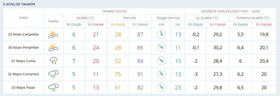 29 Nisan Çarşamba günü parçalı bulutlu havanın hakim olması beklenirken sıcaklıkların 21 dereceye kadar çıkacağı tahmin ediliyor. 30 Nisan Perşembe günü ise hava sıcaklığının 24 dereceye ulaşması öngörülüyor.