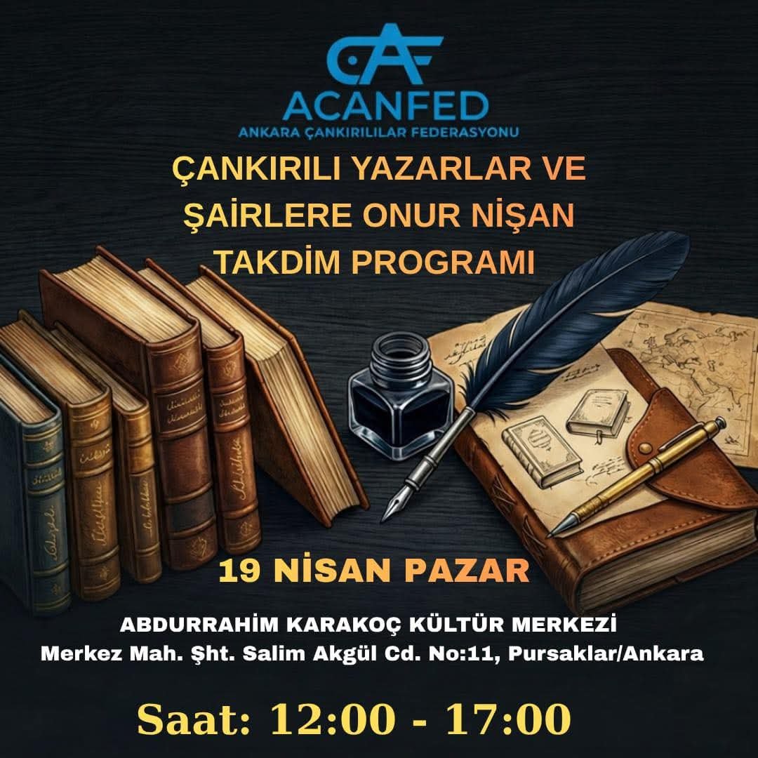 Çankırılı yazar ve şairlere onur nişanı takdim edilecek programın, 19 Nisan Pazar günü saat 12.00–17.00 arasında Pursaklar Merkez Mahallesi Şehit Salim Akgül Caddesi No:11 adresinde bulunan Abdurrahim Karakoç Kültür Merkezi’nde gerçekleştirileceği bildirildi.