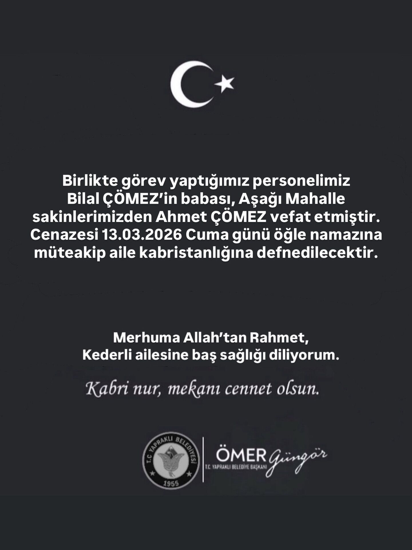 Çankırı’nın Yapraklı ilçesinde acı bir vefat haberi paylaşıldı. Yapraklı Belediyesi tarafından yapılan açıklamada, belediye personeli Bilal Çömez’in babası Ahmet Çömez’in hayatını kaybettiği duyuruldu.