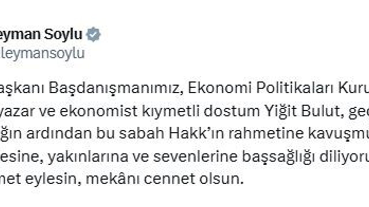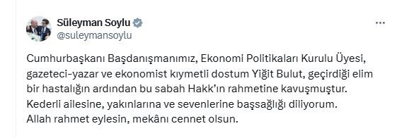 "Cumhurbaşkanı Başdanışmanımız, Ekonomi Politikaları Kurulu Üyesi, gazeteci-yazar ve ekonomist kıymetli dostum Yiğit Bulut, geçirdiği elim bir hastalığın ardından bu sabah Hakk’ın rahmetine kavuşmuştur. Kederli ailesine, yakınlarına ve sevenlerine başsağlığı diliyorum. Allah rahmet eylesin, mekânı cennet olsun."
