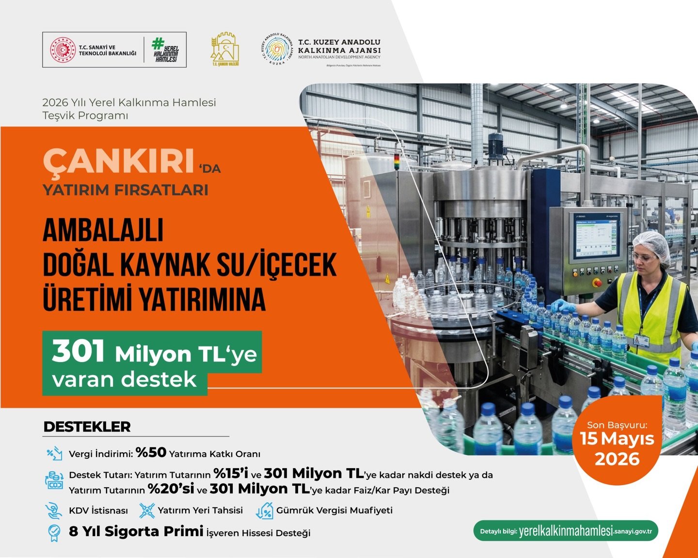 Çankırı’da ambalajlı doğal kaynak su ve içecek üretimine yönelik yatırımlar için kapsamlı teşvikler devreye alındı. Yerel Kalkınma Hamlesi Teşvik Programı kapsamında sunulan desteklerle, kentin yatırım açısından cazibe merkezi haline getirilmesi hedefleniyor.