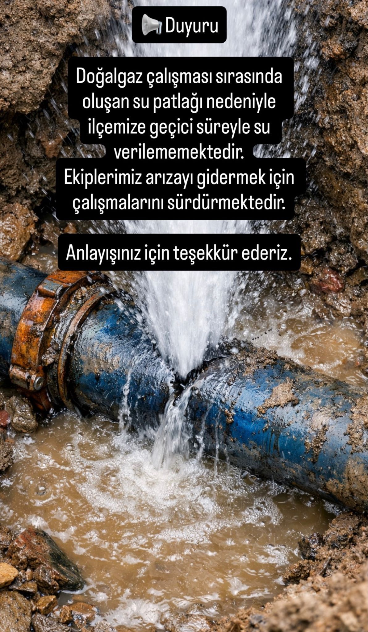 Su hattında meydana gelen patlak nedeniyle ilçedeki bazı bölgelerde su akışının kesildiği öğrenilirken, ekiplerin arızayı gidermek için yoğun şekilde çalıştığı kaydedildi. Yapılan çalışmaların tamamlanmasının ardından ilçeye yeniden su verilmesi planlanıyor.