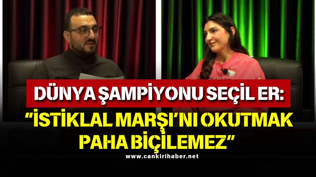 Programda, Seçil Er’in elde ettiği uluslararası başarıların Çankırı ve Türkiye adına taşıdığı anlam da ele alındı. Gazeteci Burak Kaya, şampiyon sporcuya, “Çankırı’yı orada temsil ettiniz ve dünyada İstiklal Marşı’nı okutarak göğsümüzü kabarttınız. Böyle bir noktaya gelmek nasıl bir duygu?” sorusunu yöneltti.