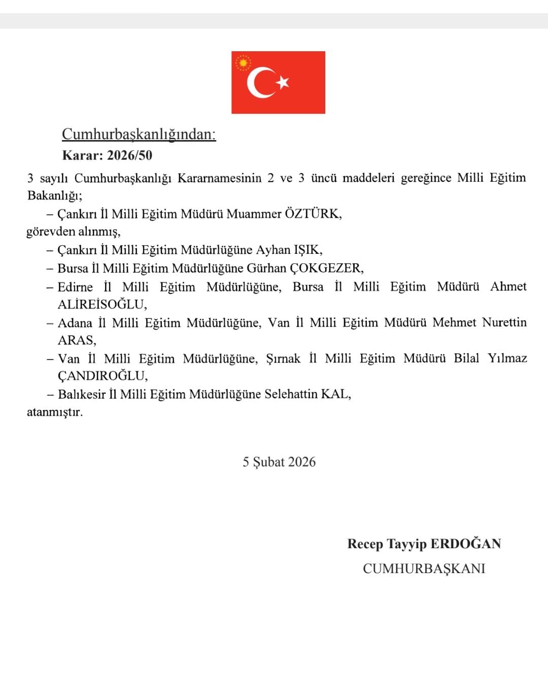 Cumhurbaşkanlığı tarafından yayımlanan 2026/50 sayılı karar kapsamında Millî Eğitim Bakanlığı bünyesinde çeşitli il millî eğitim müdürlüklerine yönelik yeni atamalar gerçekleştirildi. 5 Şubat 2026 tarihli Resmî Gazete’de yayımlanan karar doğrultusunda Çankırı İl Millî Eğitim Müdürlüğünde görev değişikliği resmiyet kazandı.