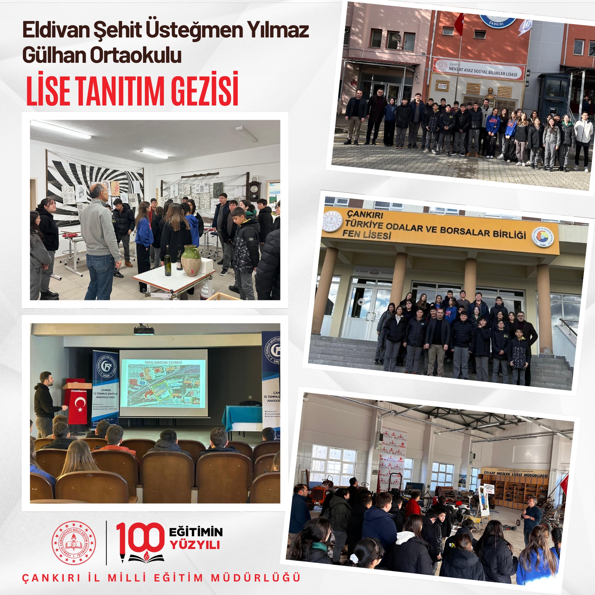 Eldivan Şehit Üsteğmen Yılmaz Gülhan Ortaokulu 8. sınıf öğrencileri için, Türkiye Yüzyılı Maarif Modeli doğrultusunda anlamlı bir eğitim faaliyeti hayata geçirildi. Öğrencilerin lise tercih sürecini daha bilinçli ve sağlıklı şekilde yönetebilmeleri amacıyla Çankırı il merkezinde bulunan farklı lise türlerine yönelik tanıtım gezisi düzenlendi.