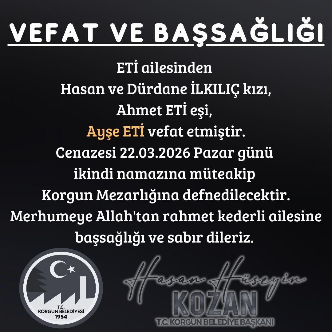 Çankırı’nın Korgun ilçesinde yaşanan vefat haberi, bölgede derin üzüntüye neden oldu. Eti ailesinden Ayşe Eti’nin hayatını kaybettiği bildirildi.