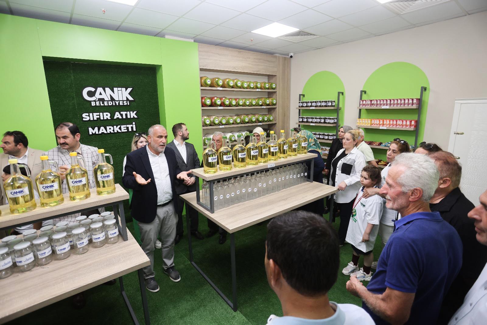 Başkan Sandıkçı, “Canik Sıfır Atık Marketimizle hem çevre bilincini yaygınlaştırıyor hem de aile ekonomisine katkı sunuyoruz. Evlerinde ayrı bir şekilde biriktirdikleri geri dönüştürülebilir atıklar karşılığında vatandaşlarımız, temel gıda, temizlik ve glütensiz ürünlerden alışveriş yapabiliyor” dedi. Market, cam, metal, plastik ve alüminyum atıkların kilo bazlı puanlama sistemi ile alışverişe dönüştürüldüğü bir uygulamaya sahip.