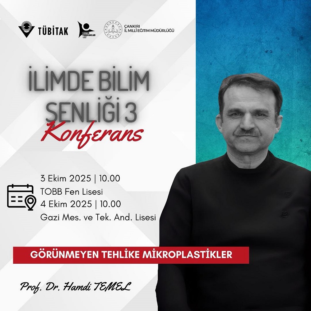 Çankırı İl Milli Eğitim Müdürlüğü, çevre sorunlarına dikkat çekmek amacıyla önemli bir etkinliğe hazırlanıyor. TÜBİTAK destekli “İlimde Bilim Şenliği 3” kapsamında düzenlenecek konferansta, Prof. Dr. Hamdi Temel “Görünmeyen Tehlike: Mikroplastikler” başlıklı sunum yapacak.