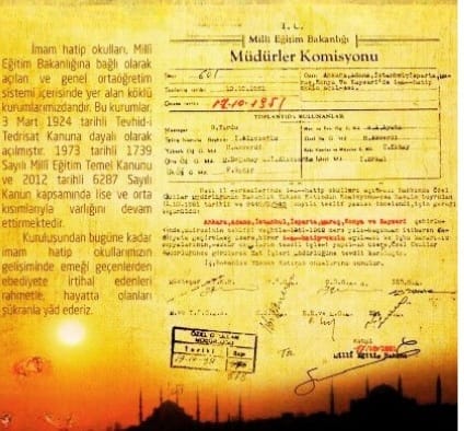 Türkiye’de Millî Eğitim Bakanlığı’na bağlı olarak eğitim veren İmam Hatip okulları, 3 Mart 1924 tarihli Tevhid-i Tedrisat Kanunu temelinde kurulmuş; 13 Ekim 1951 tarihli Müdürler Komisyonu kararı ve dönemin Millî Eğitim Bakanı Tevfik İleri’nin 17 Ekim 1951’deki onayıyla bugünkü yapısına kavuşmuştur.