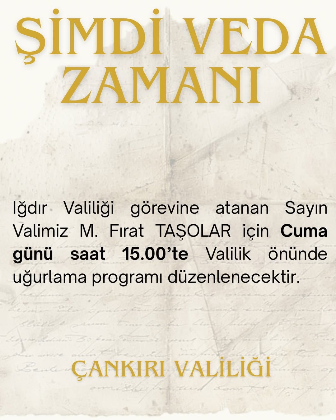 Çankırı Valiliği’nin sosyal medya hesapları üzerinden yapılan duyuruda, “Şimdi veda zamanı… Iğdır Valiliği görevine atanan Sayın Valimiz Fırat Taşolar için Cuma günü saat 15.00’te Valilik önünde uğurlama programı düzenlenecektir” ifadelerine yer verildi. Düzenlenecek programda protokol üyeleri, kamu kurum ve kuruluşlarının temsilcileri ile vatandaşların yer alması bekleniyor.