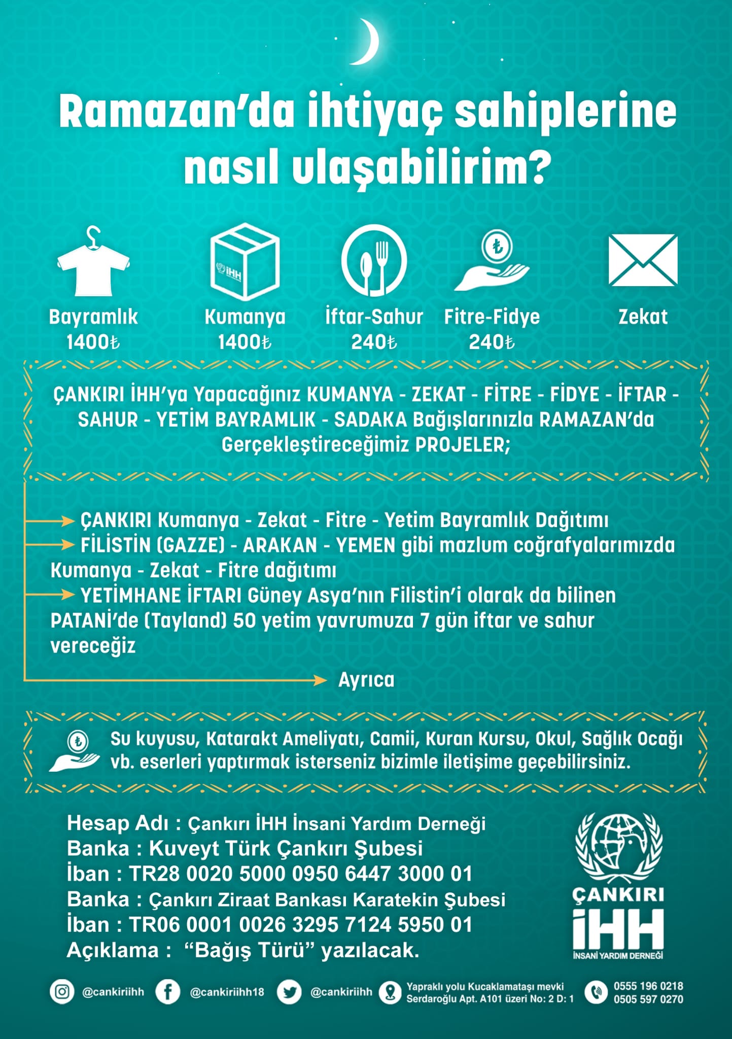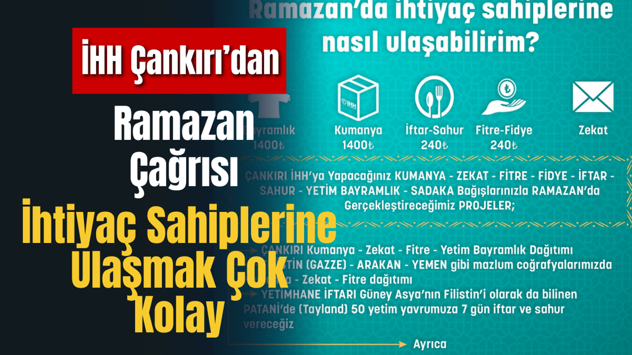 Çankırı’da Ramazan ayı öncesi yardımlaşma ve dayanışma faaliyetleri hız kazandı. Çankırı İHH İnsani Yardım Derneği, ihtiyaç sahiplerine ulaşmak isteyen vatandaşlar için kapsamlı bir yardım kampanyası başlattı. Hazırlanan projeler kapsamında hem Türkiye’de hem de dünyanın farklı bölgelerinde yardıma muhtaç insanlara destek olunması hedefleniyor.