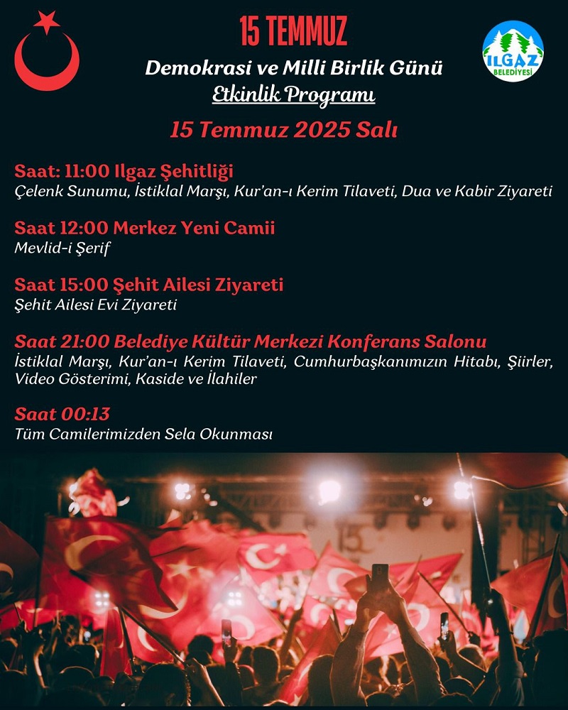 Ilgaz Belediyesi, 15 Temmuz Demokrasi ve Millî Birlik Günü kapsamında anlamlı bir anma programı düzenliyor. Gün boyu sürecek etkinliklerle, 15 Temmuz 2016’da yaşanan hain darbe girişimine karşı verilen kahramanlık destanı bir kez daha hatırlatılacak.