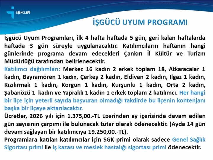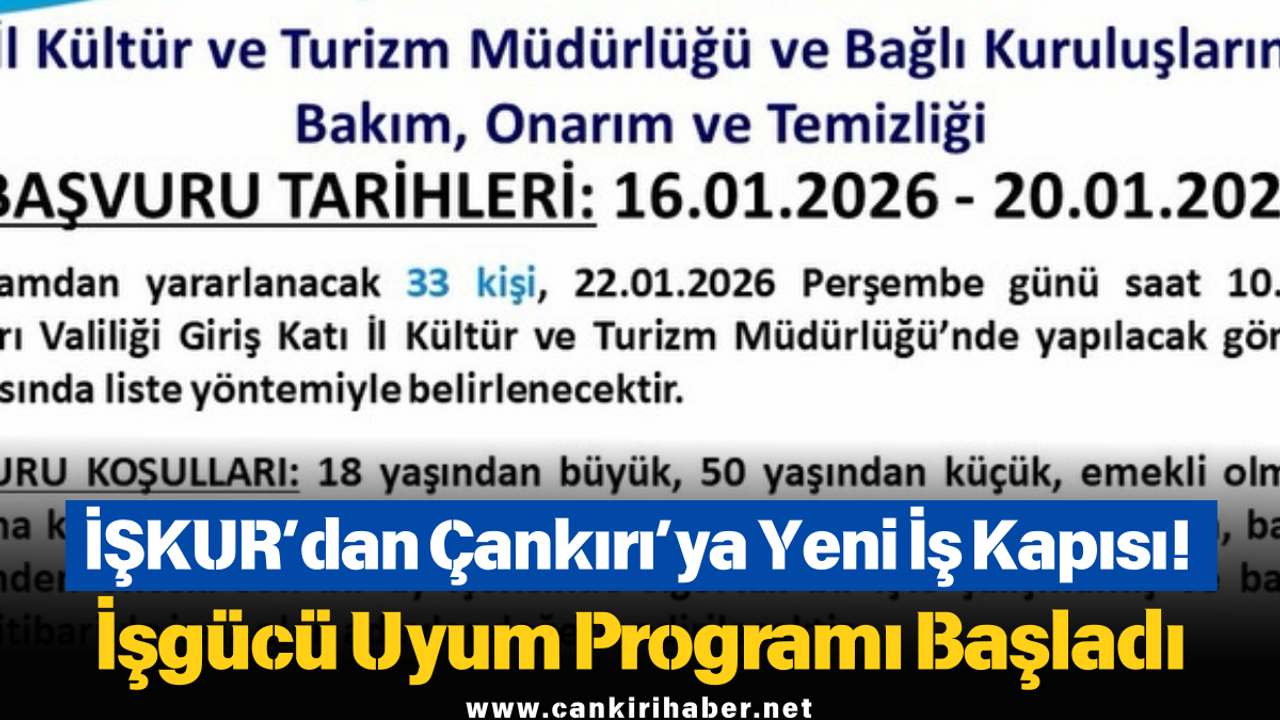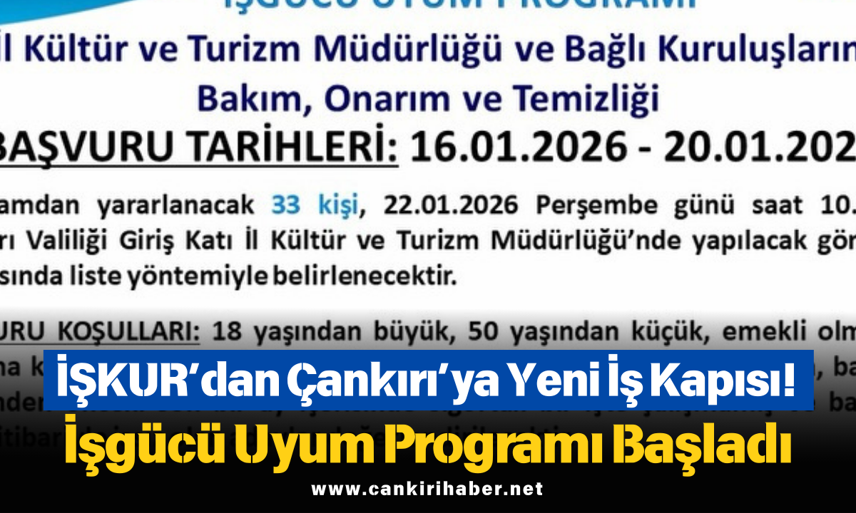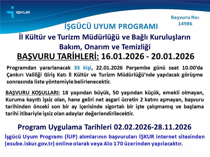 İŞKUR tarafından yürütülen İşgücü Uyum Programı (İUP) kapsamında, Çankırı İl Kültür ve Turizm Müdürlüğü ile bağlı kuruluşlarda görevlendirilmek üzere 33 kişilik personel alımı yapılacağı duyuruldu.