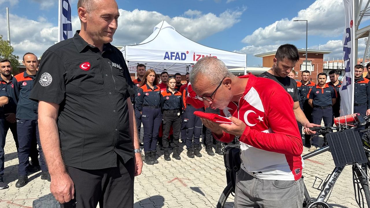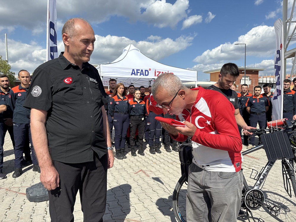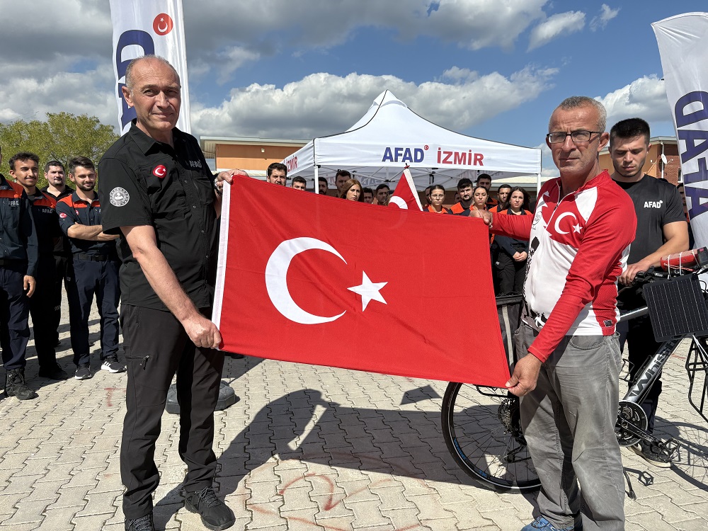 Yaklaşık 20 yıldır Türkiye’nin farklı şehirlerini bisikletiyle gezen Kotluk, bu kez 1.350 kilometrelik bir parkuru kat edecek. İzmir İl Afet ve Acil Durum Müdürlüğü’nden teslim aldığı Türk bayrağını Kahramanmaraş Valiliği’ne ulaştıracak olan gezgin, “Bu bayrak, depremde hayatını kaybeden vatandaşlarımız için bir vefa simgesi olacak” dedi.