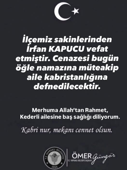 Yapraklı Belediye Başkanı Ömer Güngör, yayımladığı taziye mesajında, “İlçemiz sakinlerinden İrfan Kapucu vefat etmiştir. Merhuma Allah’tan rahmet, kederli ailesine baş sağlığı diliyorum. Kabri nur, mekânı cennet olsun” ifadelerine yer verdi.