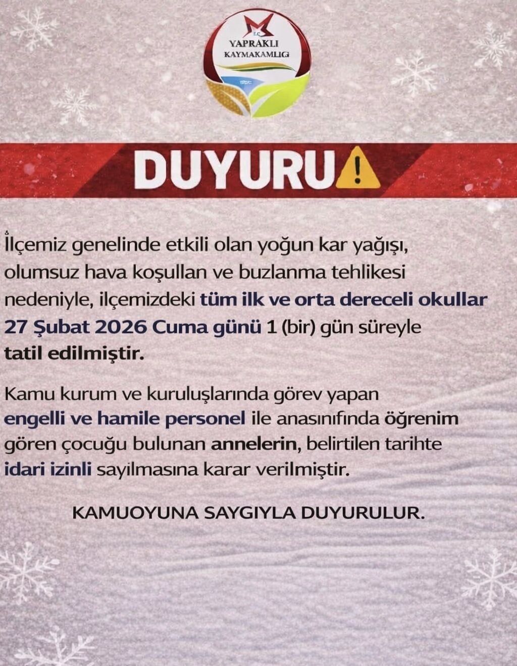 Çankırı’nın Yapraklı ilçesinde etkili olan yoğun kar yağışı ve olumsuz hava koşulları nedeniyle eğitim-öğretimde tedbir kararı alındı. İlçe genelindeki tüm ilk ve orta dereceli okullar 27 Şubat 2026 Cuma günü 1 gün süreyle tatil edildi. Kar ve buzlanma tehlikesi nedeniyle alınan bu önlemle, öğrencilerin güvenliğinin sağlanması hedeflendi.