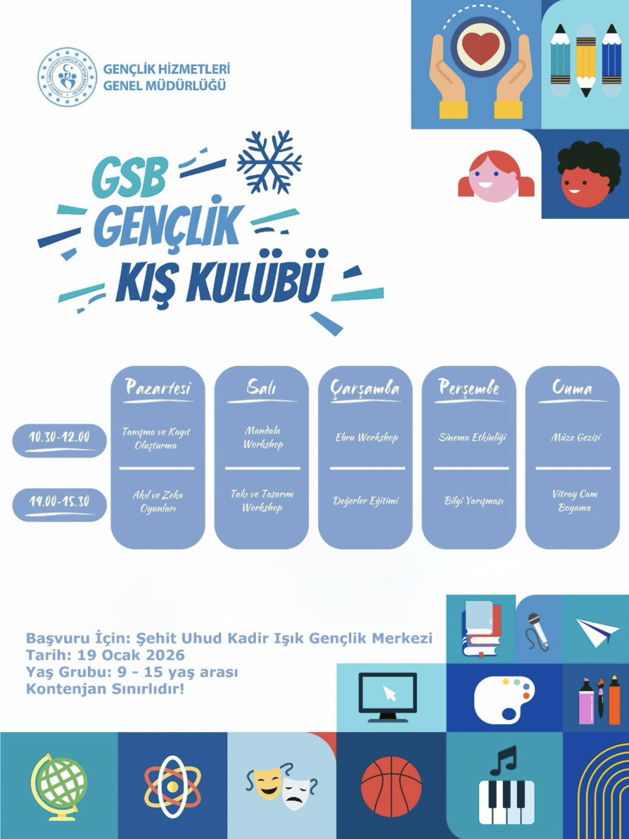 Şehit Uhud Kadir Işık Gençlik Merkezi’nde gerçekleştirilecek olan GSB Gençlik Kış Kulübü etkinlikleri, 19 Ocak 2026 tarihinde başlayacak. Program, 9-15 yaş arası çocuk ve gençlere yönelik olarak planlanırken, kontenjanın sınırlı olduğu bildirildi. Etkinlikler hafta boyunca farklı temalarla düzenlenecek ve katılımcılara çok yönlü gelişim imkânı sunacak.
