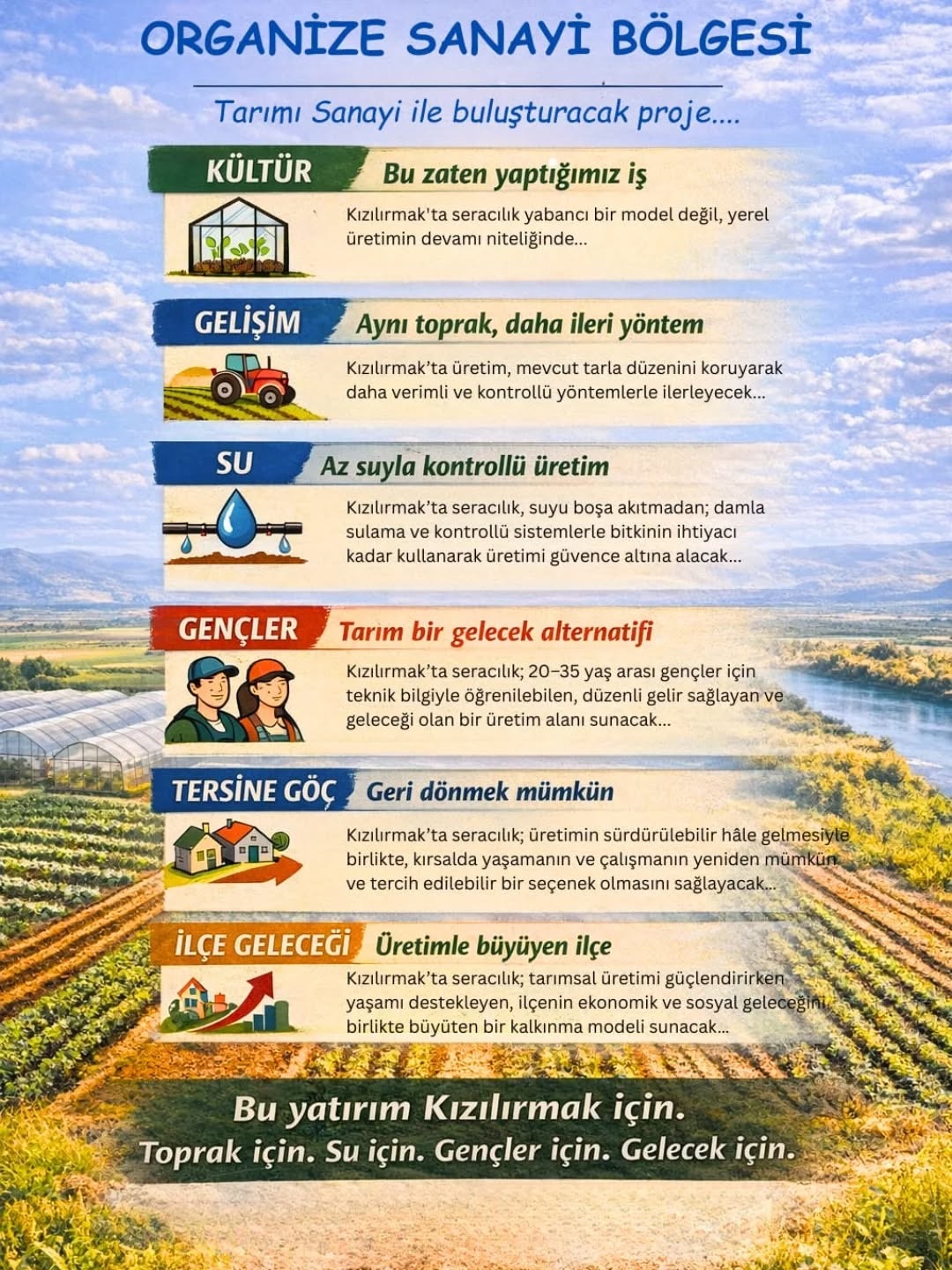 Paylaşımda projeye ilişkin temel başlıklar kültür, gelişim, su yönetimi, gençler, tersine göç ve ilçe geleceği temaları üzerinden aktarıldı. Kızılırmak’ta seracılık faaliyetlerinin yabancı bir model değil, yerel üretimin devamı niteliğinde olduğu vurgulanırken, üretimin mevcut tarla düzenini koruyarak daha verimli ve kontrollü yöntemlerle ilerleyeceği ifade edildi. Özellikle su yönetimi konusunda damla sulama ve kontrollü sistemlerin ön plana çıkacağı, suyun verimli kullanımıyla sürdürülebilir üretimin güvence altına alınacağı belirtildi.