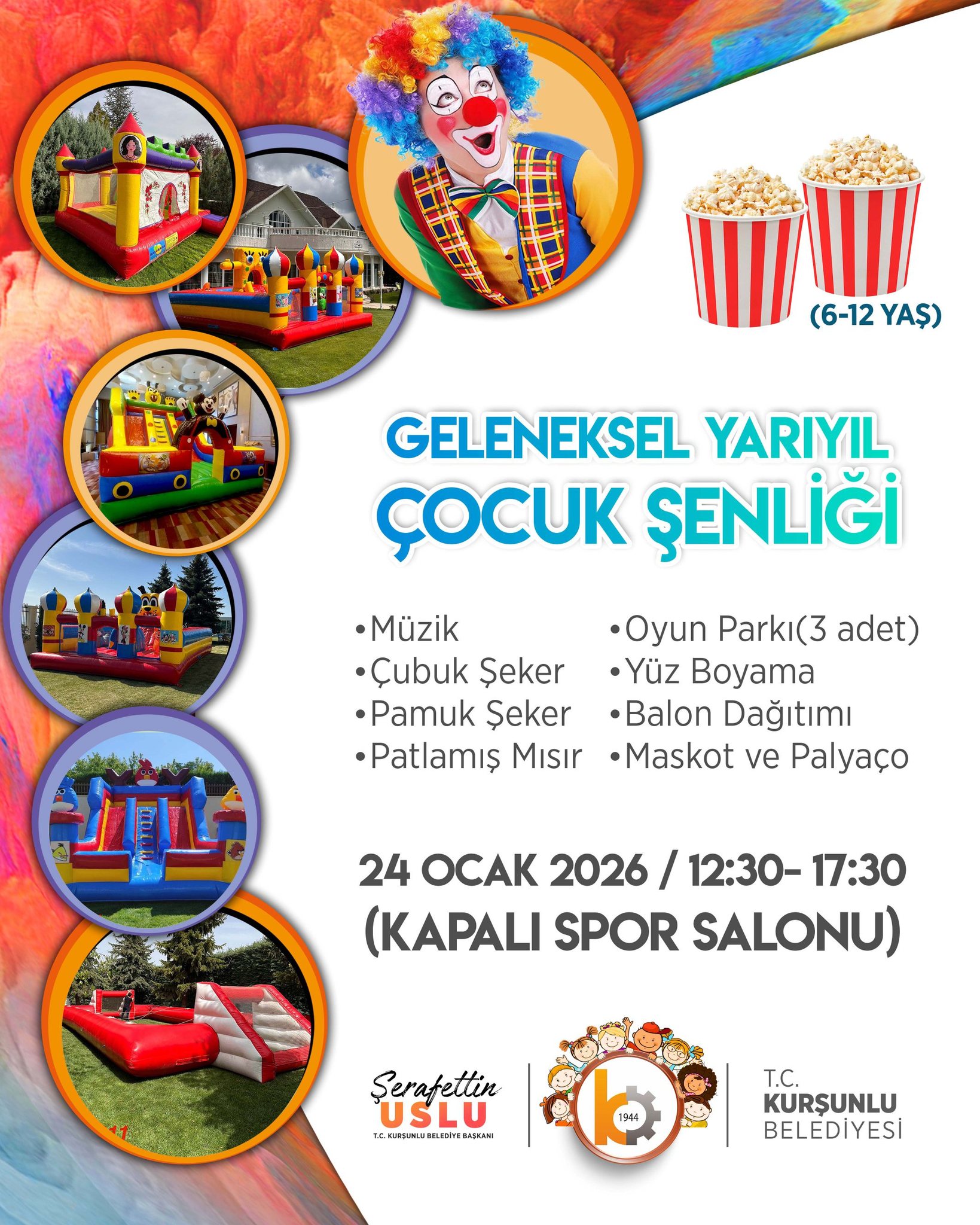 Belediye tarafından yapılan duyuruya göre, 24 Ocak 2026 Cumartesi günü, 12.30 – 17.30 saatleri arasında Kurşunlu Kapalı Spor Salonu’nda gerçekleştirilecek şenlikte, 6-12 yaş arası çocuklar için birbirinden renkli etkinlikler düzenlenecek.