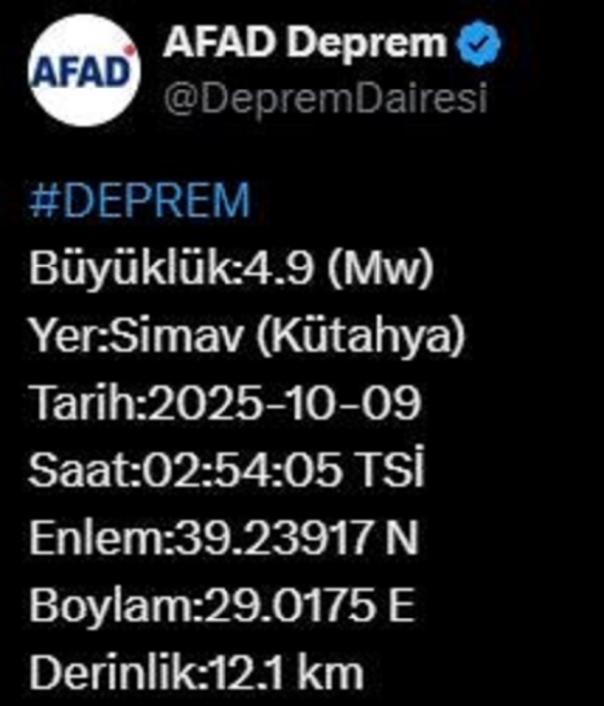 AFAD’ın internet sitesinde yer alan bilgilere göre, deprem saat 02.54’te Kütahya’nın Simav ilçesi merkezli olarak kaydedildi. Yerin 12.1 kilometre derinliğinde meydana gelen sarsıntı, başta Kütahya olmak üzere çevre illerden de hissedildi.
