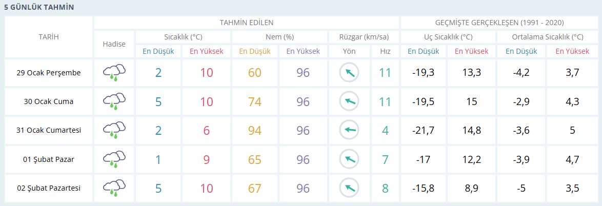 5 günlük tahminin son günü olan 2 Şubat Pazartesi günü ise en düşük sıcaklığın 5 derece, en yüksek sıcaklığın 10 derece olması beklenirken, nem oranlarının yine yüksek seviyelerde seyredeceği tahmin ediliyor.
