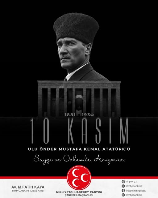 Milliyetçi Hareket Partisi (MHP) Çankırı İl Başkanı Mehmet Fatih Kaya, 10 Kasım dolayısıyla yayımladığı anma mesajında, Atatürk’ün Türk milletine bıraktığı mirasın her zaman korunacağını belirtti. Kaya, mesajında şu ifadelere yer verdi: