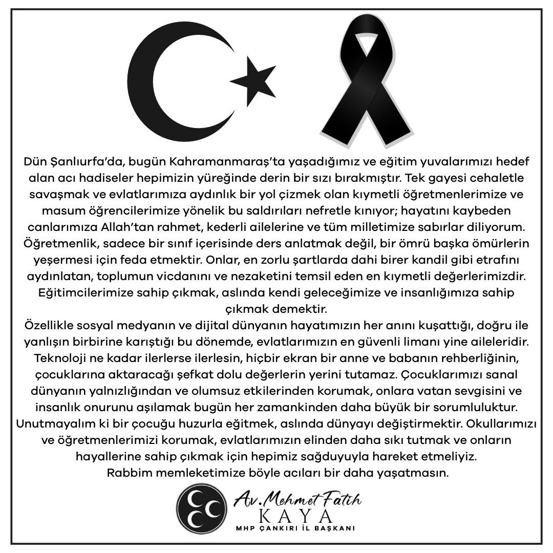 MHP Çankırı İl Başkanlığı, son günlerde Şanlıurfa ve Kahramanmaraş’ta yaşanan ve eğitim kurumlarını hedef alan olaylara ilişkin yazılı bir açıklama yaptı. Açıklamada, yaşanan hadiselerin toplumda derin üzüntüye yol açtığı vurgulandı.