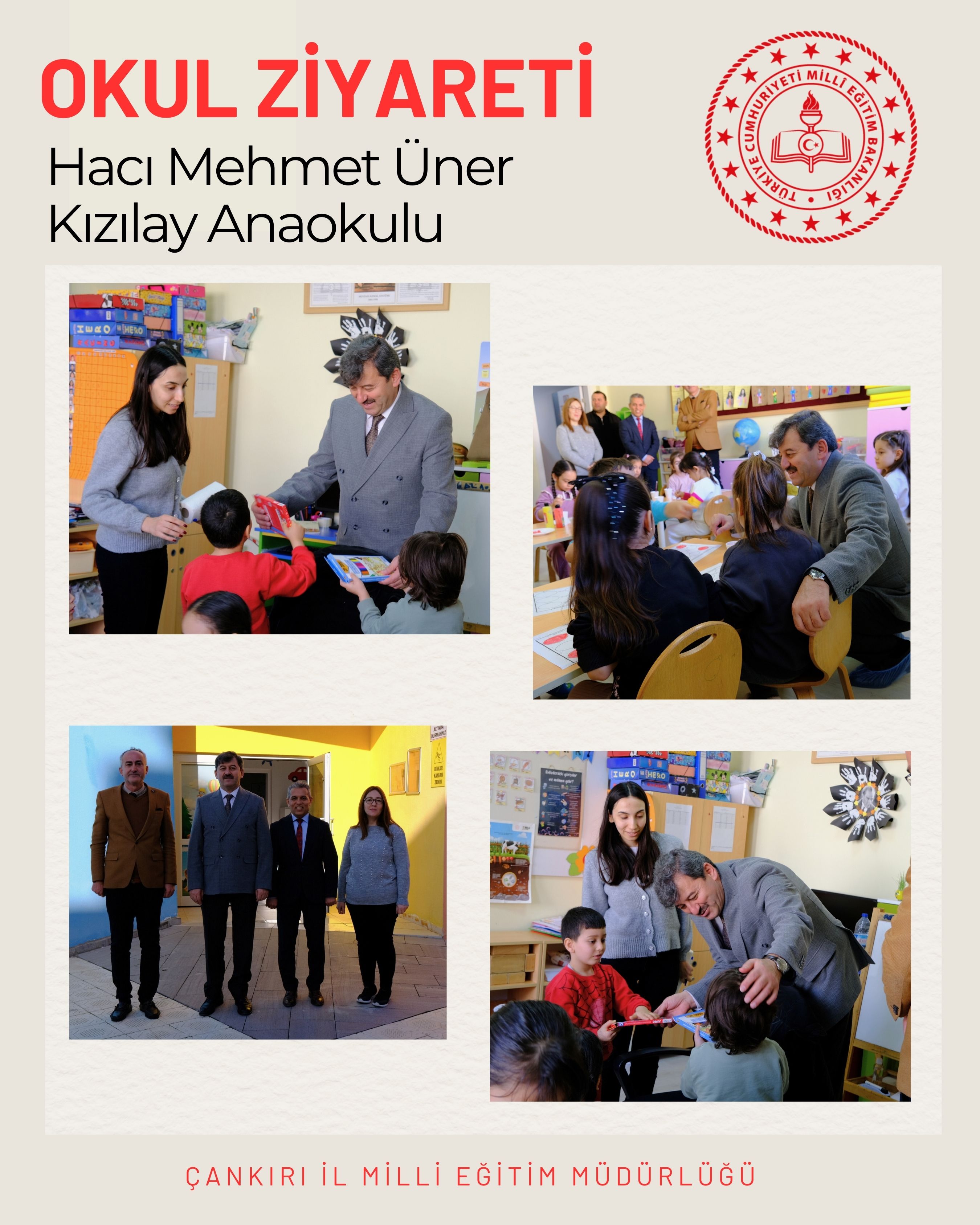 Çankırı İl Millî Eğitim Müdürü Ayhan Işık, okul öncesi eğitim faaliyetlerini yerinde incelemek amacıyla Hacı Mehmet Üner Kızılay Anaokulu’nu ziyaret ederek eğitim ortamlarını yakından gözlemledi. Gerçekleştirilen ziyaret kapsamında sınıflar, oyun alanları ve öğrencilerin ortak kullanım alanlarında detaylı incelemelerde bulunuldu.