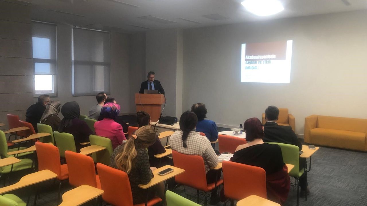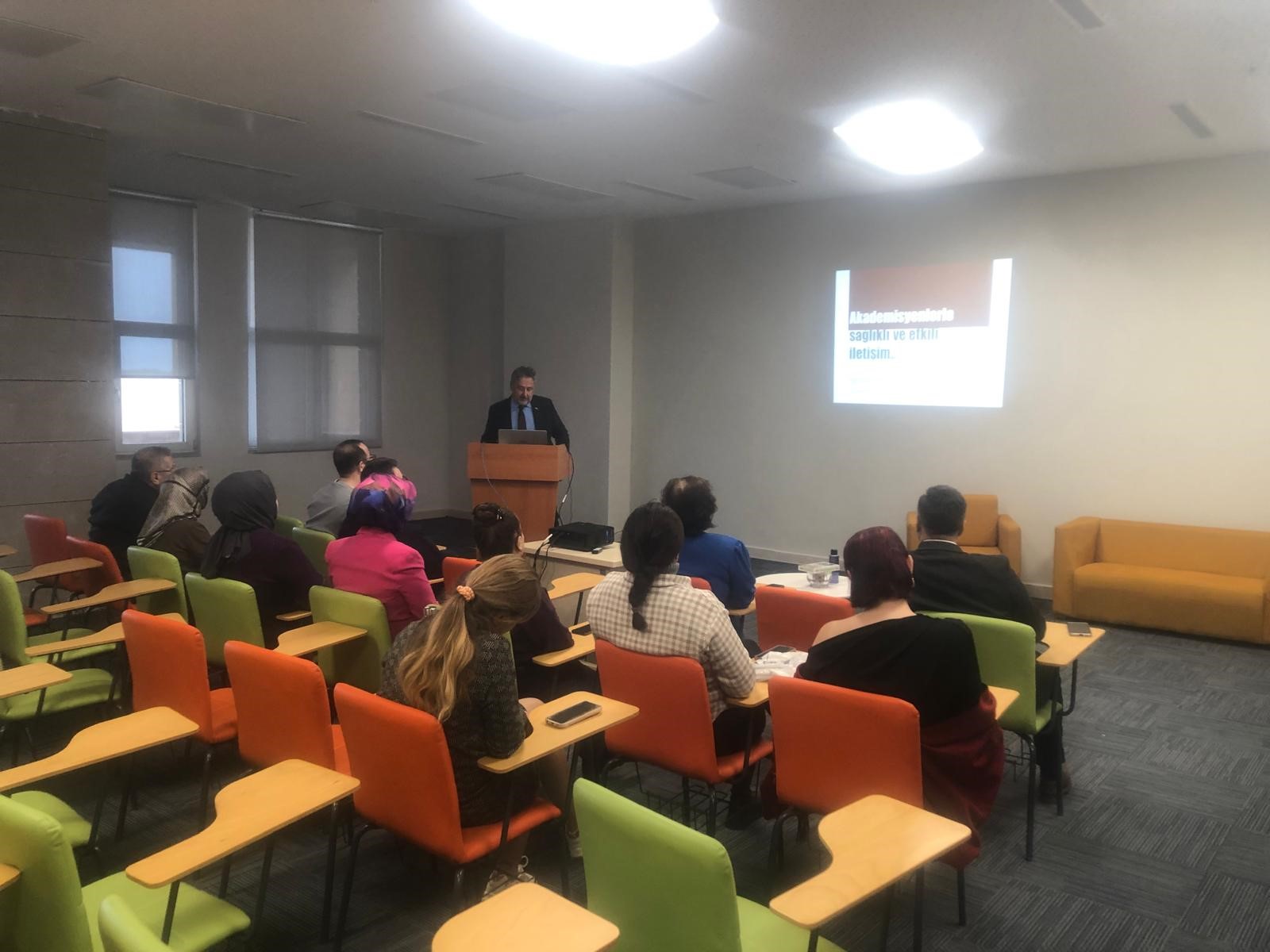 Programın bir diğer oturumunda ise “Akademisyen ve Öğrenciyle İletişim” eğitimi, Kullanıcı Hizmetleri Akademik Danışmanı Öğr. Gör. İbrahim Ethem Olukcuoğlu tarafından gerçekleştirildi. Bu bölümde, farklı kullanıcı profilleri, iletişim yöntemleri ve karakter analizleri üzerinden hizmet sunumunun nasıl daha etkili hale getirilebileceği paylaşıldı.