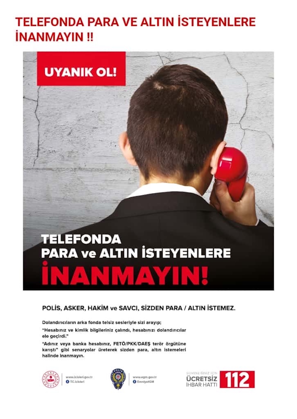 Yapılan çalışmalarda özellikle son dönemde artış gösteren telefon ve internet dolandırıcılıklarına karşı vatandaşların kişisel bilgilerini paylaşmamaları, kimlik ve banka bilgilerini tanımadıkları kişilerle paylaşmamaları gerektiği vurgulandı. Ayrıca, şüpheli durumlarda vakit kaybetmeden 112 Acil Çağrı Merkezi veya en yakın emniyet birimine bilgi verilmesi gerektiği hatırlatıldı.