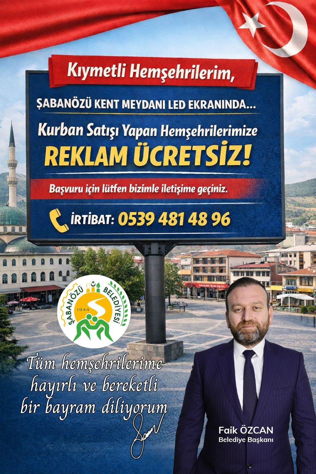 ÖZEL HABER/Şabanözü Belediyesi, yaklaşan Kurban Bayramı öncesinde kurban satışı yapan vatandaşlara destek olmak amacıyla yeni bir uygulamayı hayata geçirdi. İlçe merkezinde bulunan Kent Meydanı LED ekranında, kurban satıcılarına yönelik reklamların ücretsiz olarak yayınlanacağı duyuruldu.
