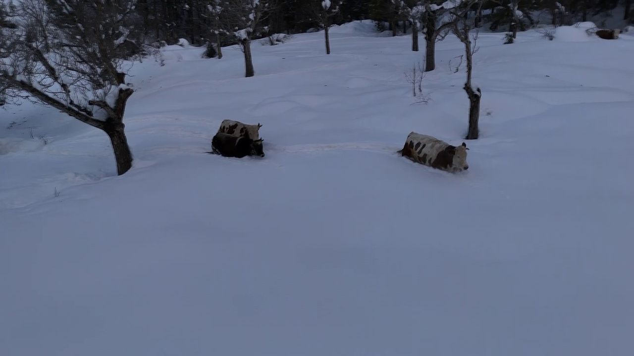 Dron görüntülerinde, beyaz örtüyle kaplanan bölgede büyükbaş hayvanların adım atmakta güçlük çektiği, zaman zaman duraksayarak ilerlemeye çalıştığı görüldü. Yoğun kar yağışının, özellikle kırsal bölgelerde yaşamı zorlaştırdığı dikkat çekti.