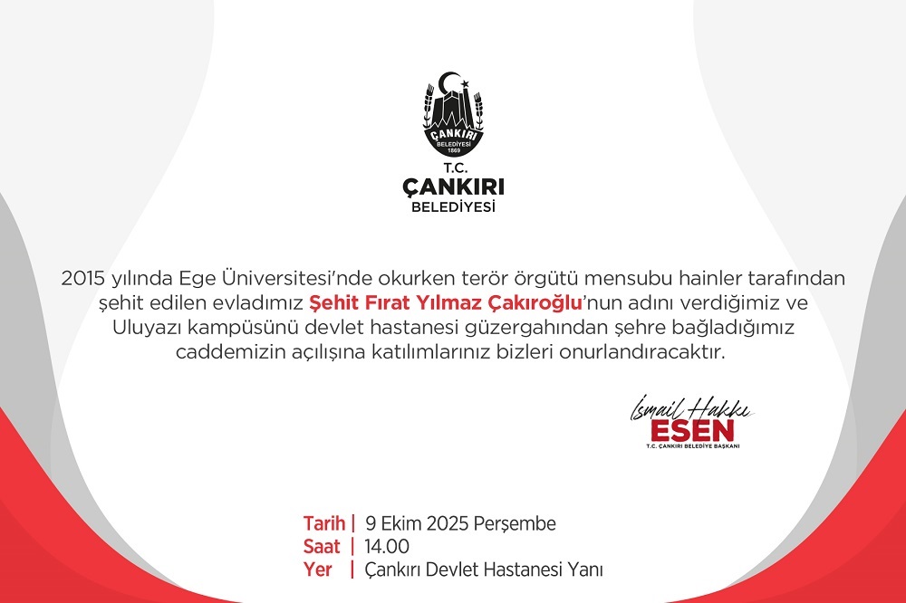 Çankırı Belediyesi, 2015 yılında Ege Üniversitesi’nde terör örgütü mensuplarının saldırısı sonucu hayatını kaybeden Şehit Fırat Yılmaz Çakıroğlu’nun adını yaşatmak için anlamlı bir projeyi hayata geçiriyor. Belediye tarafından düzenlenen törende, Çakıroğlu’nun ismi yeni açılan caddeye verilecek.