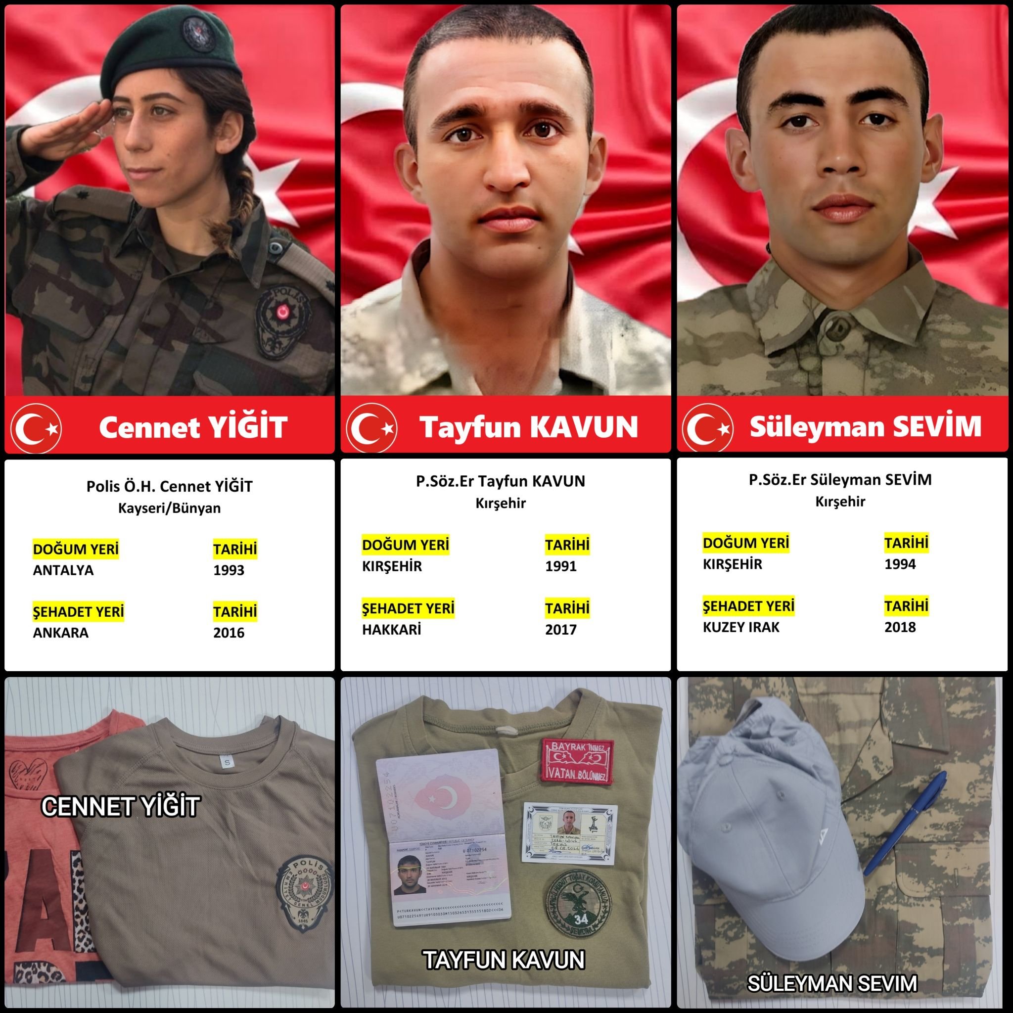 ÖZEL HABER/ Türkiye Gaziler ve Şehit Aileleri Vakfı (TÜGŞAV) Çankırı Şubesi tarafından yapılan açıklamayla, aziz şehitlerimizin hatıralarını yaşatacak anlamlı bir gelişme kamuoyuyla paylaşıldı. Şehitlerimiz Cennet Yiğit, Tayfun Kavun ve Süleyman Sevim’e ait kişisel eşyaların Çankırı Şehitler Müzesi’nde sergilenmeye başlandığı bildirildi.