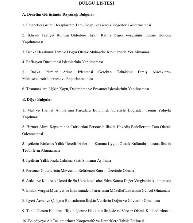 Denetim sonucunda, belediyenin 102 TL ve 105 döviz hesabı dışında izlenen ancak muhasebeye işlenmeyen banka hesapları bulunduğu, bu hesapların değerlemeye tabi tutulmadığı ve mali tablolarda yer almadığı belirlendi. Sayıştay, bu durumun belediyenin finansal raporlarını “yanıltıcı” hale getirdiğini vurguladı.