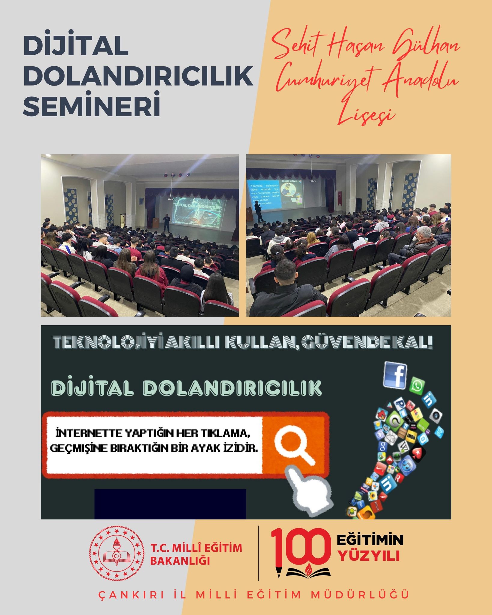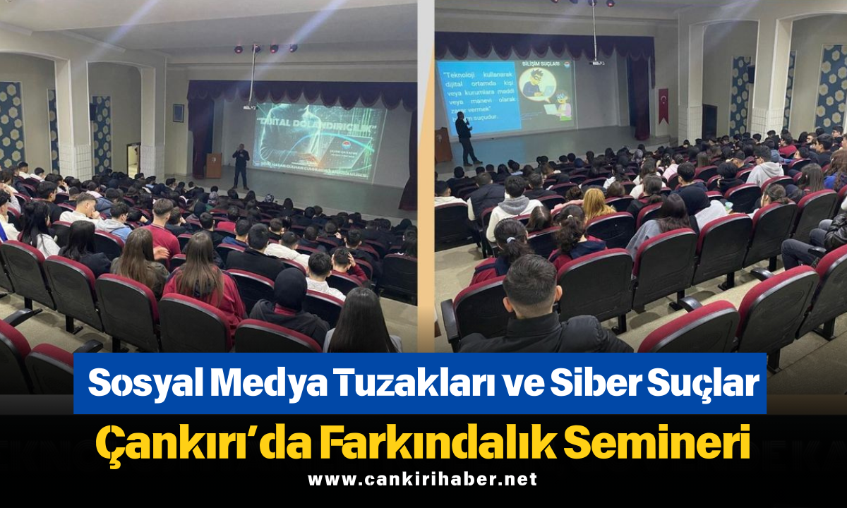 Çankırı’da eğitim kurumlarında dijital güvenlik farkındalığını artırmaya yönelik çalışmalar devam ediyor. Bu kapsamda Şehit Hasan Gülhan Cumhuriyet Anadolu Lisesi’nde “Dijital Dolandırıcılık ve Bilişim Suçları” konulu bilgilendirme semineri düzenlendi. Öğrencilerin yoğun katılım gösterdiği programda, özellikle gençleri hedef alan internet dolandırıcılığı yöntemleri detaylı şekilde ele alındı.