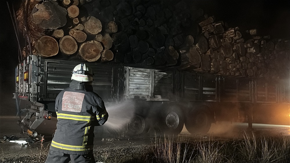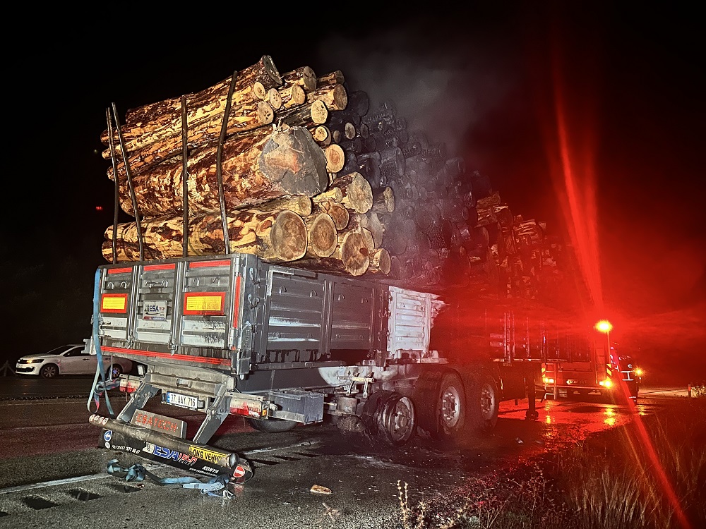 Olay, gece saatlerinde meydana geldi. Dorseden dumanlar yükseldiğini fark eden sürücü, aracı hemen yol kenarına çekerek 112 Acil Çağrı Merkezinden yardım istedi. Kısa sürede bölgeye ulaşan itfaiye ekipleri, tomruklara da sıçrayan alevleri kontrol altına alarak yangını söndürdü.