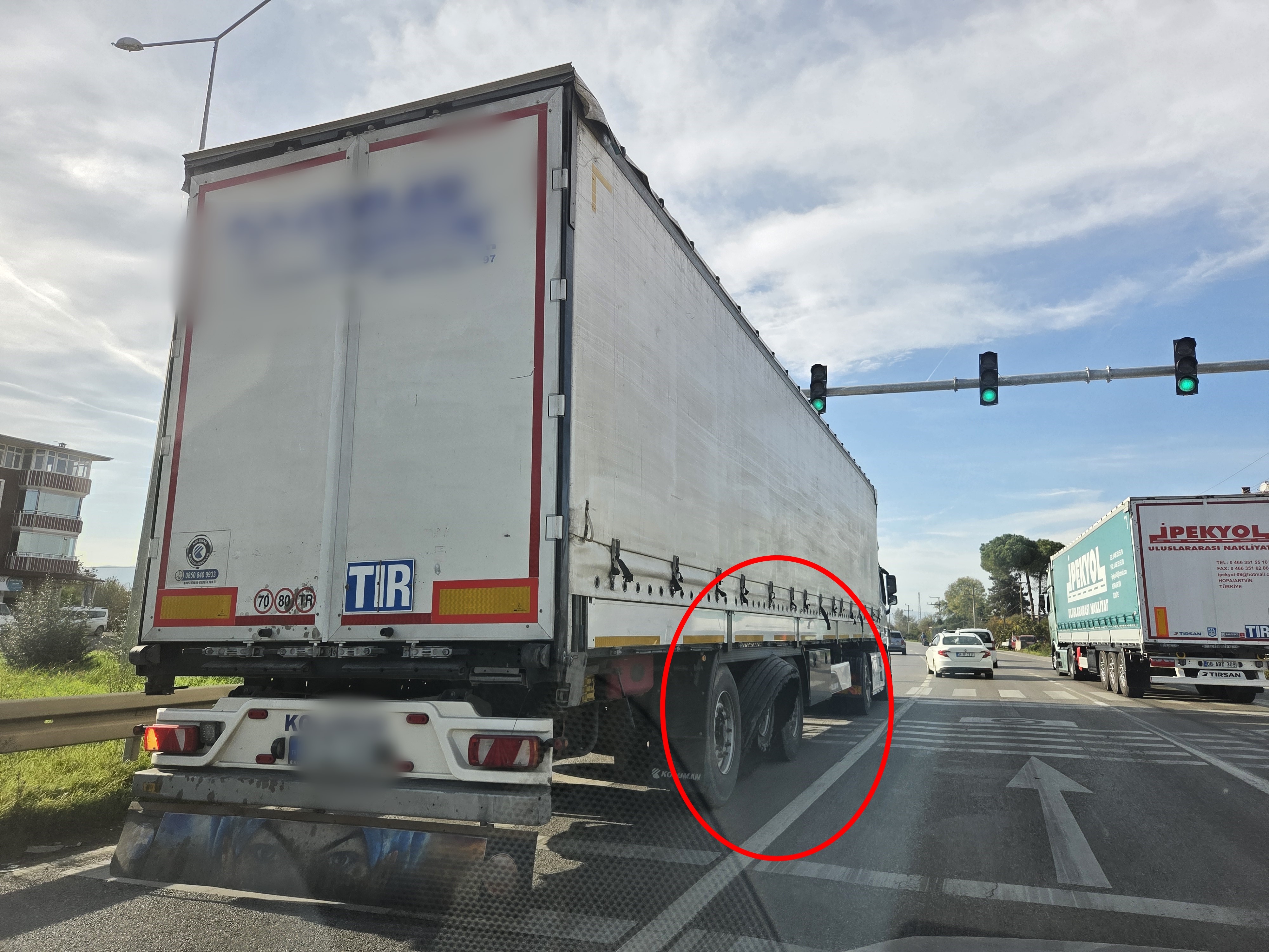 Bir süre arızalı lastikle yol almaya devam eden tır şoförü, korna seslerinin artması üzerine durumu fark ederek aracı şehirlerarası yoldan çıkarıp yol kenarına çekti. Tırdan inerek lastikleri kontrol eden sürücü, sağ arka teker grubunda ciddi bir hasar bulunduğunu tespit etti. Şoförün gerekli incelemeleri yaptıktan sonra yol yardım talebinde bulunduğu öğrenildi.