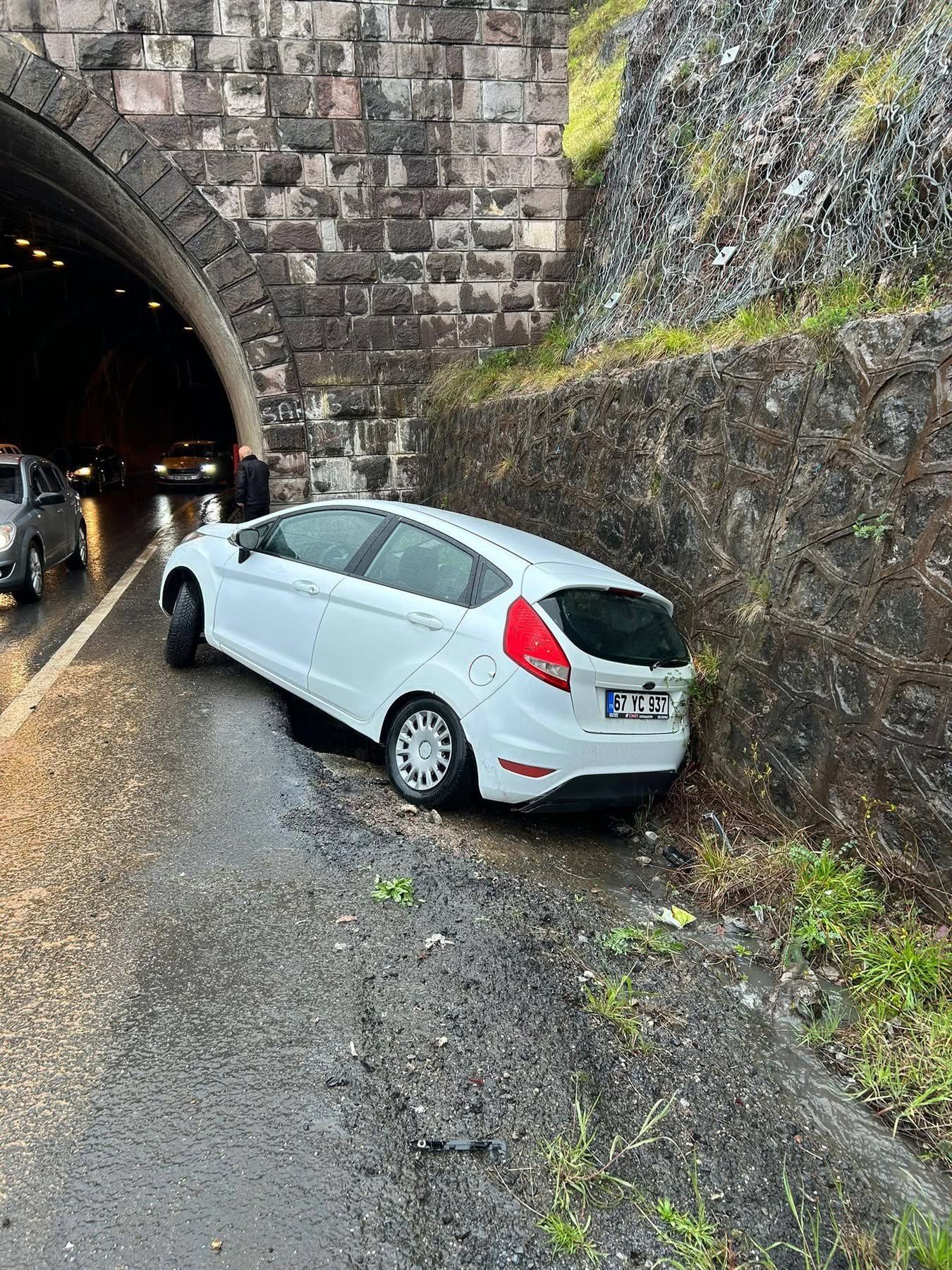 Zonguldak’ta meydana gelen trafik kazasında, sürücüsünün kontrolünden çıkan bir otomobil tünel çıkışında istinat duvarına çarparak durabildi. Kazada yaralanan olmazken araçta maddi hasar oluştu.