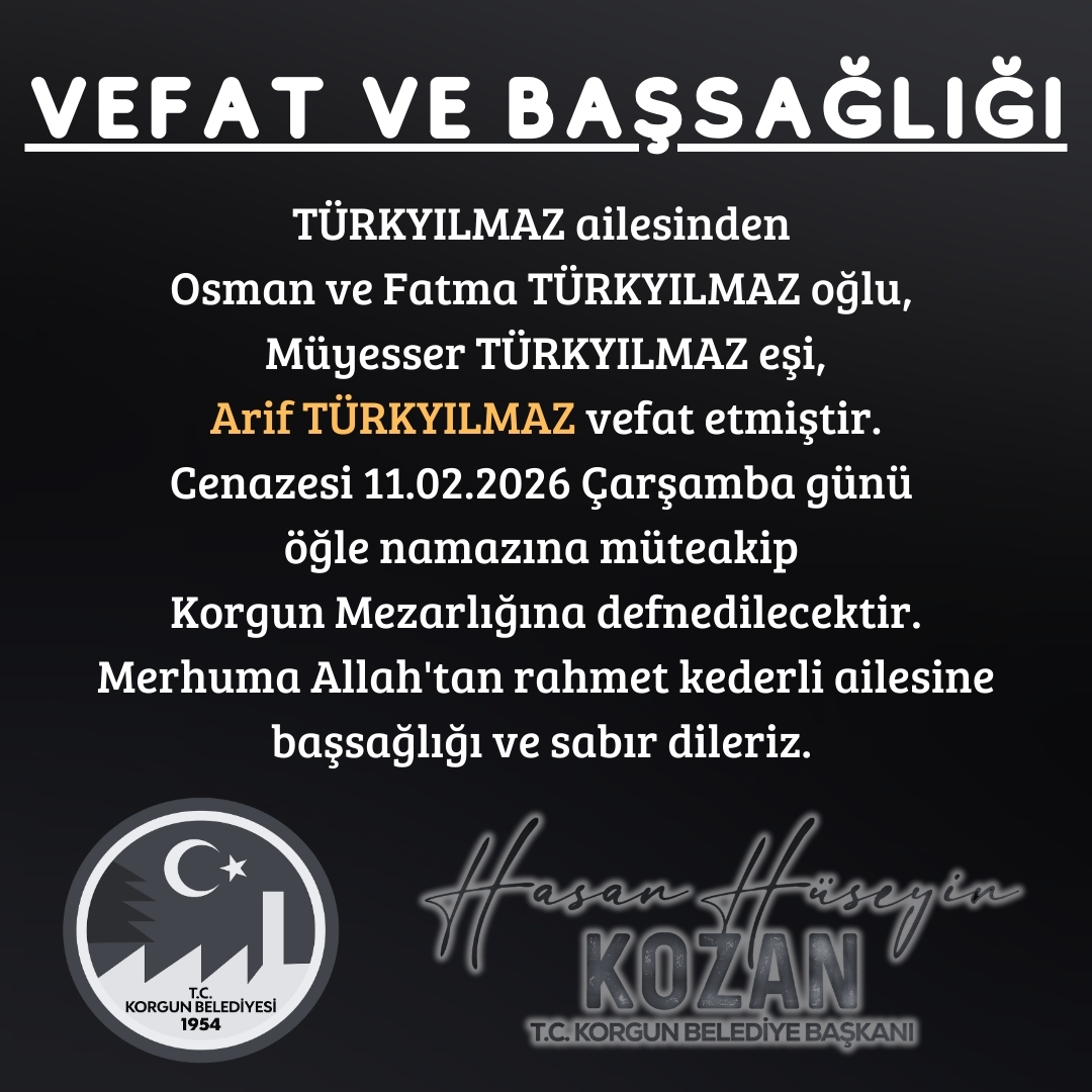 Merhum Arif Türkyılmaz’ın cenazesinin 11 Şubat 2026 Çarşamba günü öğle namazına müteakip kılınacak cenaze namazının ardından Korgun Mezarlığı’nda defnedileceği öğrenildi.