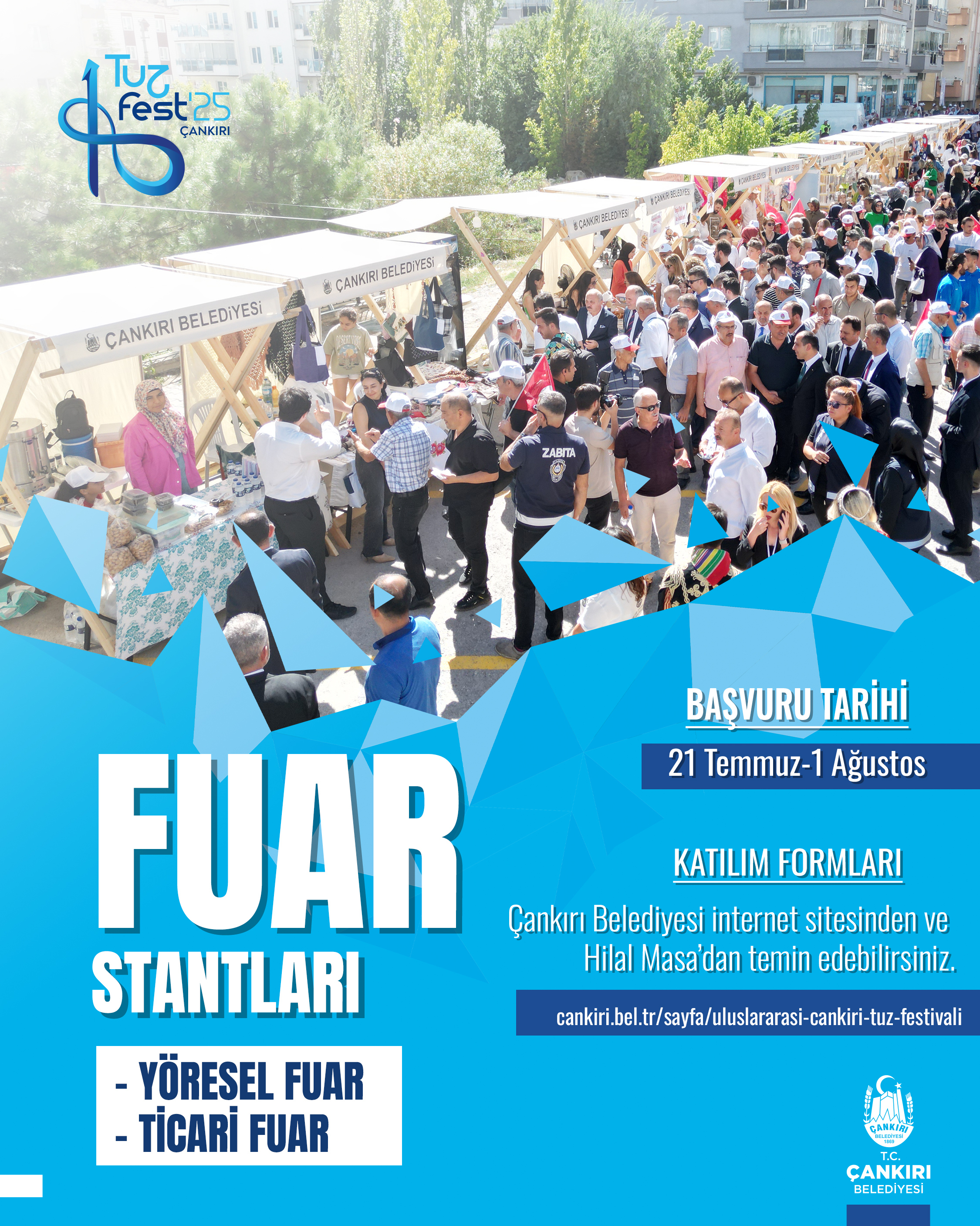 Çankırı Belediyesi’nin geleneksel hale getirdiği ve bu yıl 15-16-17 Ağustos tarihlerinde dördüncüsü düzenlenecek olan Uluslararası Çankırı Tuz Festivali, sadece eğlenceli etkinliklerle değil, aynı zamanda ekonomik katkılar sağlayan fuar alanlarıyla da dikkat çekiyor. Festivalde açılacak Yöresel ve Ticari fuarlarda ürünlerini sergilemek ve satmak isteyenler için başvuru süreci 21 Temmuz'da başlıyor.