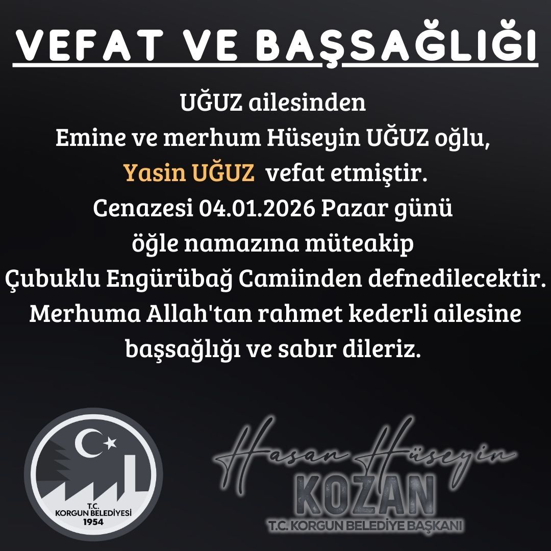 Korgun Belediye Başkanı Hasan Hüseyin Kozan da yayımladığı taziye mesajında, Yasin Uğuz’a Allah’tan rahmet, kederli ailesine ve sevenlerine sabır ile başsağlığı dileklerini iletti.