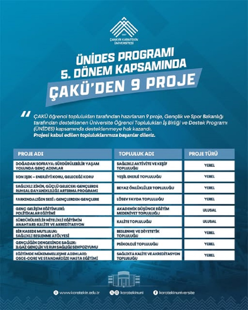 Çankırı Karatekin Üniversitesi (ÇAKÜ) öğrencileri, Gençlik ve Spor Bakanlığı tarafından desteklenen Üniversite Öğrenci Toplulukları İş Birliği ve Destek Programı (ÜNİDES) kapsamında büyük bir başarıya imza attı. Üniversite öğrencilerinin hazırladığı 9 proje, programın 5. döneminde desteklenmeye hak kazandı.