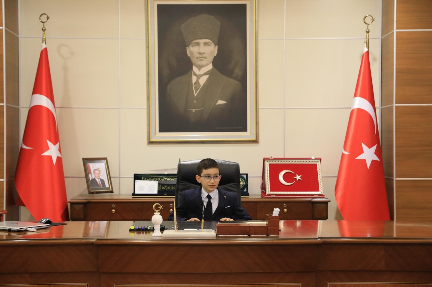 Temsili devir teslim kapsamında öğrencilerin makam koltuğuna oturmasıyla birlikte renkli anlar yaşandı. Çocuklar, düşüncelerini ve hayallerini paylaşırken, ziyaretin samimi bir atmosferde gerçekleştiği görüldü.