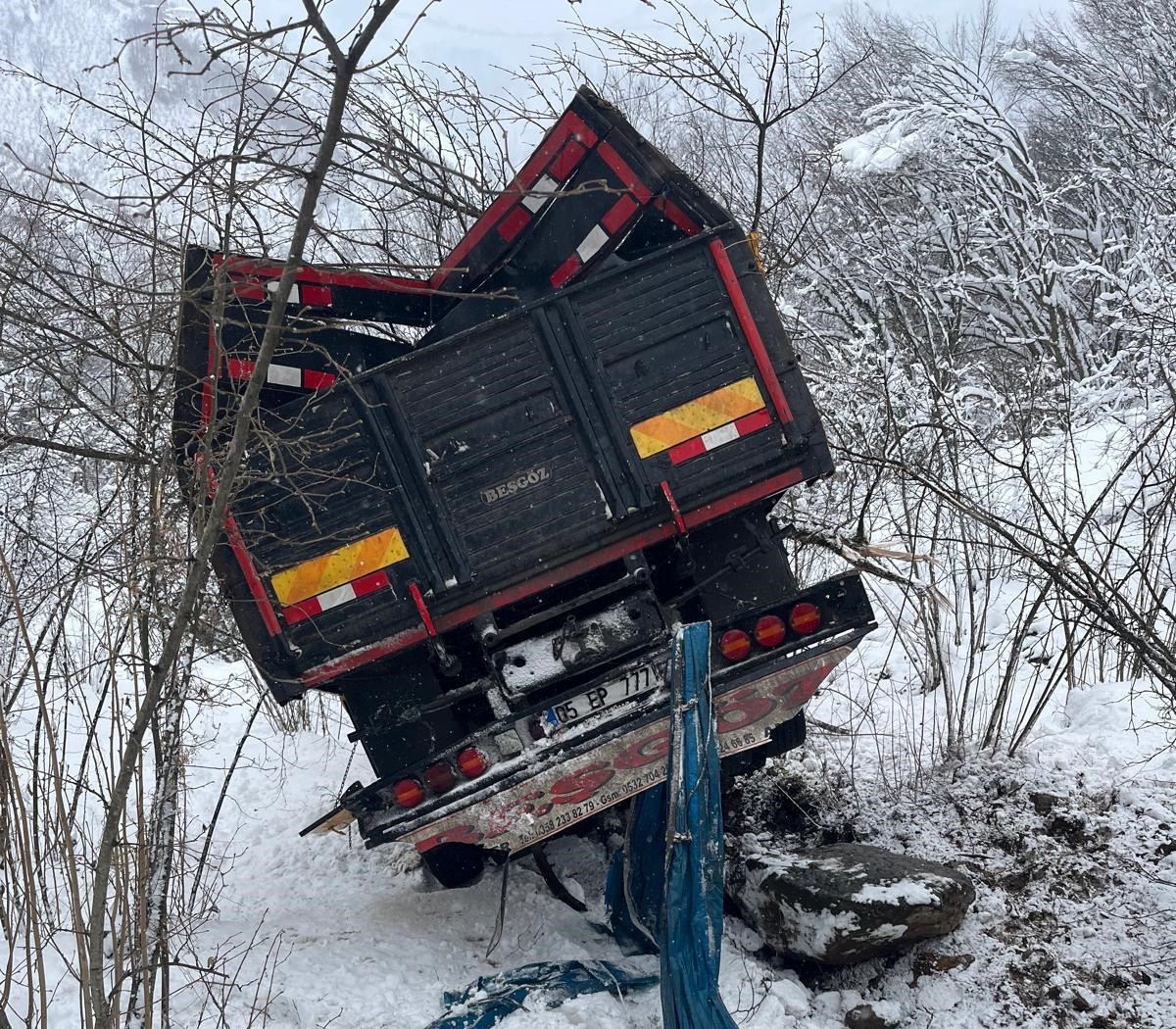 Ordu’nun Korgan ilçesinde meydana gelen trafik kazası, yürekleri ağıza getirdi. Kar yağışı sonrası buzlanmanın etkili olduğu yolda kontrolden çıkan yem yüklü tır, yaklaşık 600 metrelik uçuruma yuvarlandı. Kazada sürücü, son anda araçtan atlayarak ölümden döndü.