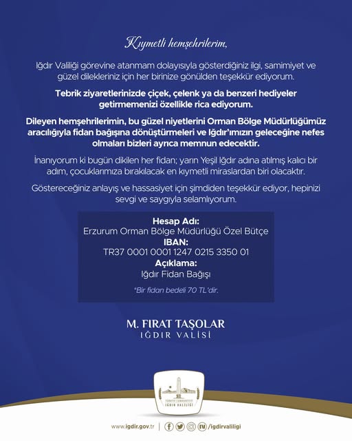 “Kıymetli hemşehrilerim, Iğdır Valiliği görevine atanmam dolayısıyla gösterdiğiniz ilgi, samimiyet ve güzel dilekleriniz için her birinize gönülden teşekkür ediyorum. Tebrik ziyaretlerinizde çiçek, çelenk ya da benzeri hediyeler getirmemenizi özellikle rica ediyorum. Dileyen hemşehrilerimin, bu güzel niyetlerini Orman Bölge Müdürlüğümüz aracılığıyla fidan bağışına dönüştürmeleri ve Iğdır’ımızın geleceğine nefes olmaları bizleri ayrıca memnun edecektir.”
