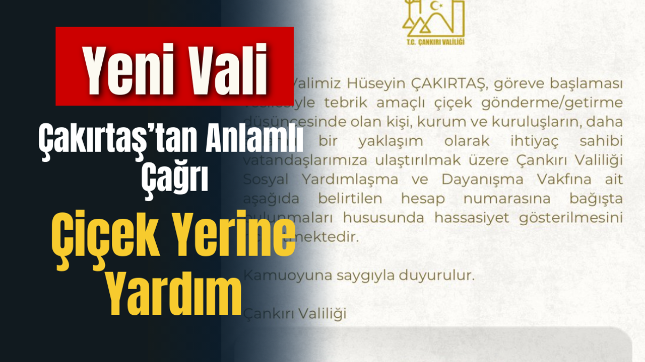 Çankırı Valisi olarak göreve başlayan Sayın Hüseyin Çakırtaş, göreve başlaması dolayısıyla kendisine iletilmesi planlanan tebrik mesajlarına yönelik anlamlı ve sosyal sorumluluk içeren bir çağrıda bulundu. Çankırı Valiliği tarafından yapılan yazılı açıklamada, çiçek gönderme ya da getirme düşüncesinde olan kişi, kurum ve kuruluşlardan, bu jestlerini daha anlamlı bir şekilde değerlendirmeleri istendi.