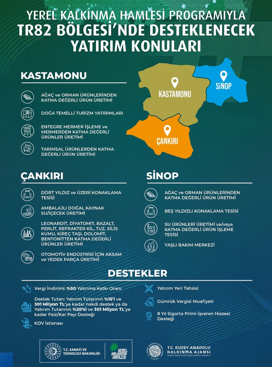 Sanayi ve Teknoloji Bakanlığı’nın yerelden ulusala kalkınma modeli doğrultusunda hayata geçirdiği 2026 Yerel Kalkınma Hamlesi Teşvik Programı kapsamında TR82 Bölgesi’nde desteklenecek yatırım konuları açıklandı. Kuzey Anadolu Kalkınma Ajansı (KUZKA) tarafından paylaşılan bilgilere göre Kastamonu ve Sinop ile birlikte Çankırı’da da bölgenin ekonomik potansiyelini artıracak yatırımlar ön plana çıkarıldı.