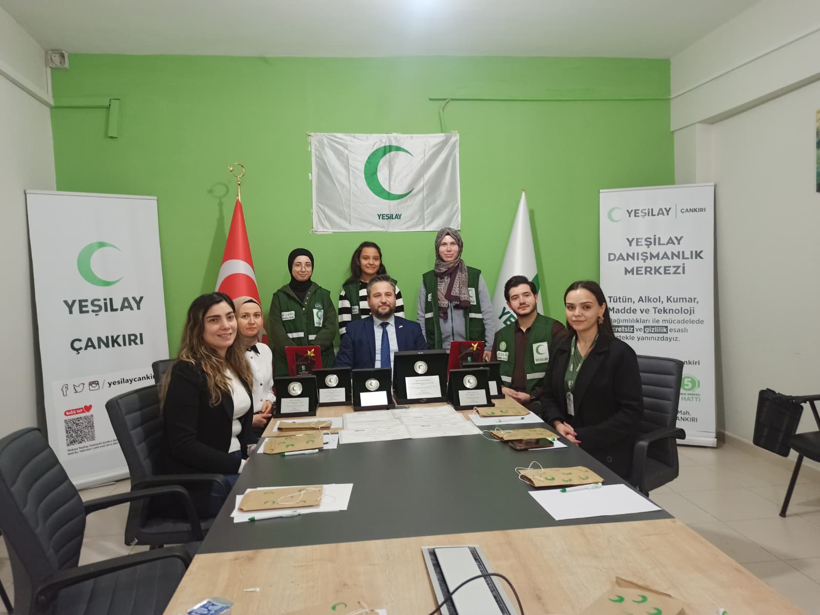 ÖZEL HABER/Türkiye Yeşilay Cemiyeti Çankırı Şube Başkanı İsmail Özcan, basın mensuplarını ağırlayarak, başarıyla geçen iki yılı değerlendirdi. Şubede düzenlenen basın toplantısına Kadın Komisyonu Başkanı Duygu Hamlı, Gençlik Komisyonu Başkanı Davud Türk, Şube Sorumlusu Gamze Kayahan, şube görevlileri, gönüllüler ve davetliler katıldı.